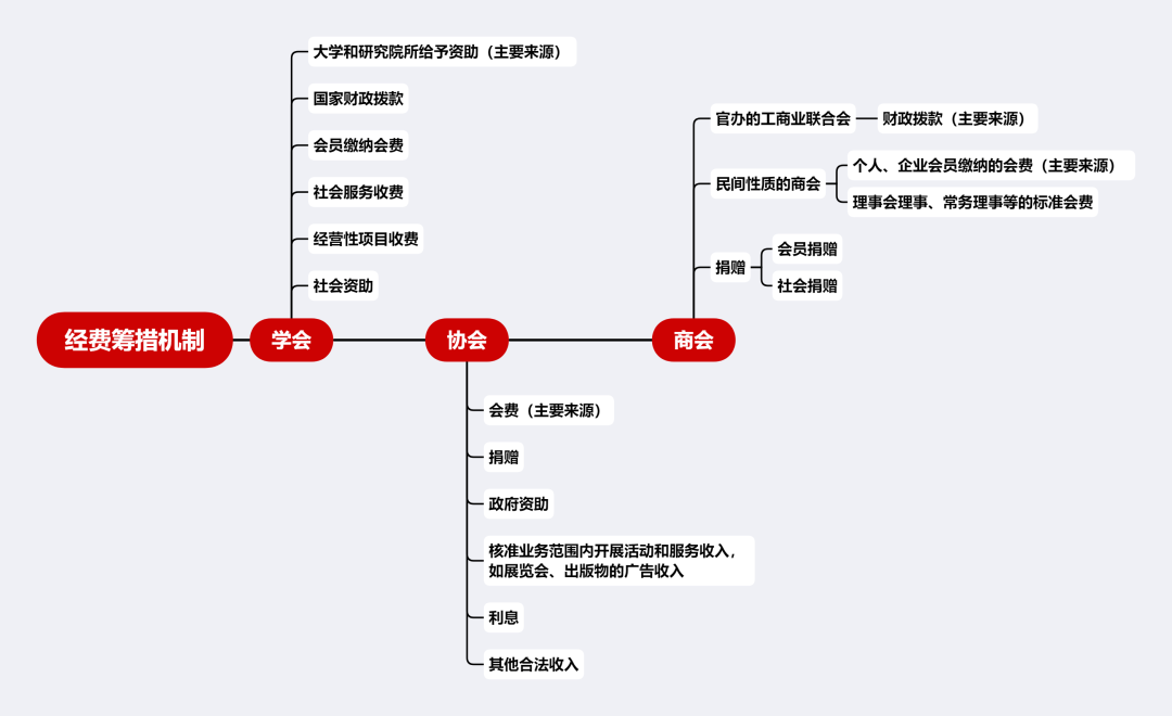 綜上,可以看到學會、協會和商會在經費籌集方面的差別,總體看,學會的經費來源中,會員繳納的會費占比很少,特別是一般會員通常不繳納會費,如果繳納也主要是常務理事以上會員,且多以單位繳付為主。學會的經費以支撐單位資助為主,行業協會經費來源較多,其中以政府撥付和會員單位會費為主要渠道。如果就民間商會而言,商會的經費主要是會員單位的會費。